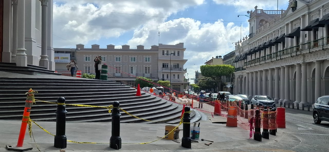 Xalapa, Ver.- Bolardos metálicos fueron colocados alrededor de la plaza Sebastián Lerdo de Tejada como parte de la rehabilitación integral que se realiza en este espacio para renovar el centro histórico.