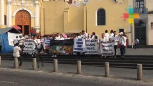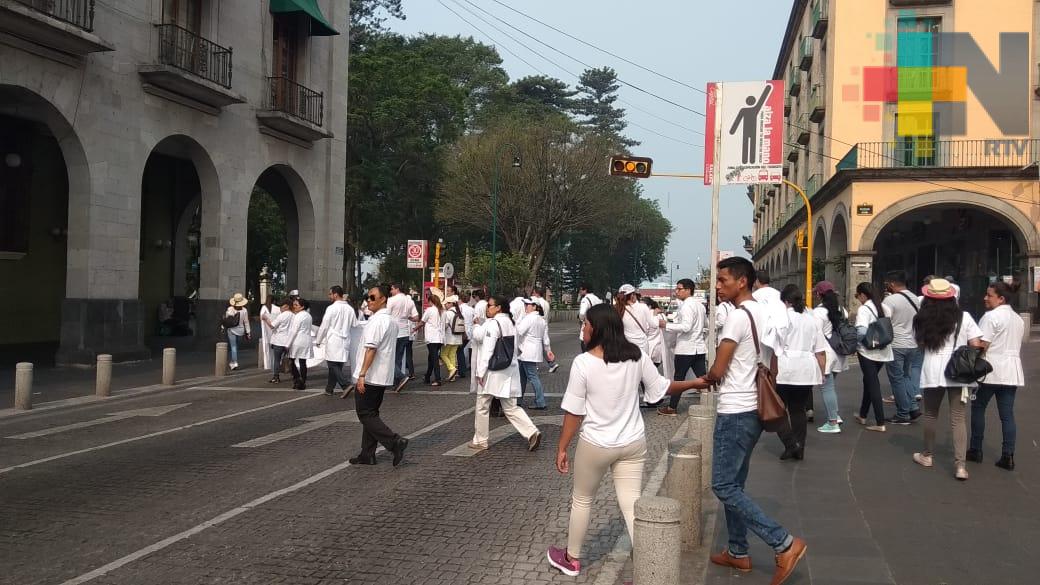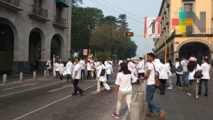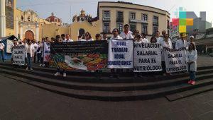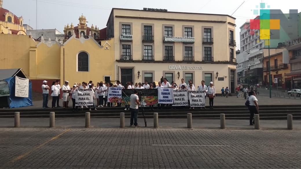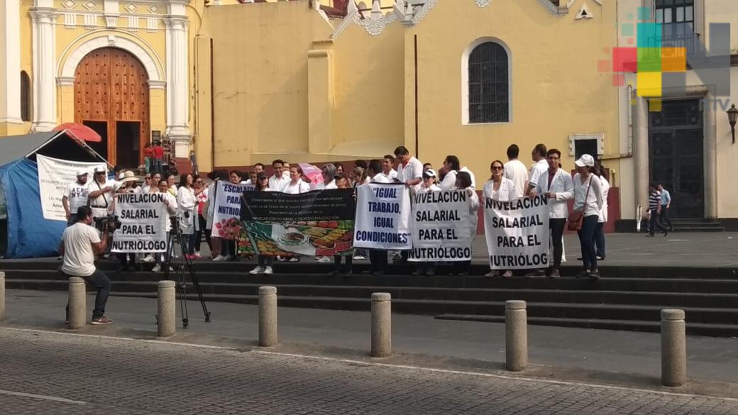 Xalapa, Ver.- Integrantes del Movimiento Estatal de Nutriólogos y Nutrición se manifestaron en la plaza Lerdo, frente a palacio de gobierno, para exigir a las autoridades del estado y el resto del país, mejoras en su ambiente laboral, resaltó la nutrióloga Claudia Caballero, integrante de dicho movimiento e indicó que esta movilización se realiza de manera simultánea en otros puntos del país.