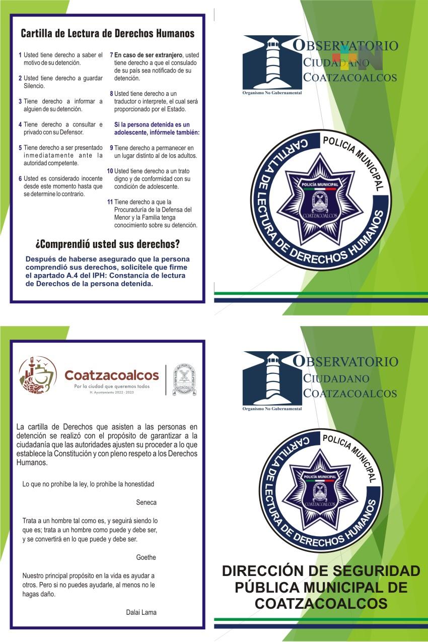 Coatzacoalcos, Ver.- Con la intensión de fortalecer a la policía municipal y evitar errores o acciones que trunquen la justicia, el Observatorio Ciudadano de Coatzacoalcos (OCC) entregó 400 cartillas de lectura de derechos humanos, que asisten a las personas en detención, para que las porten los uniformados.