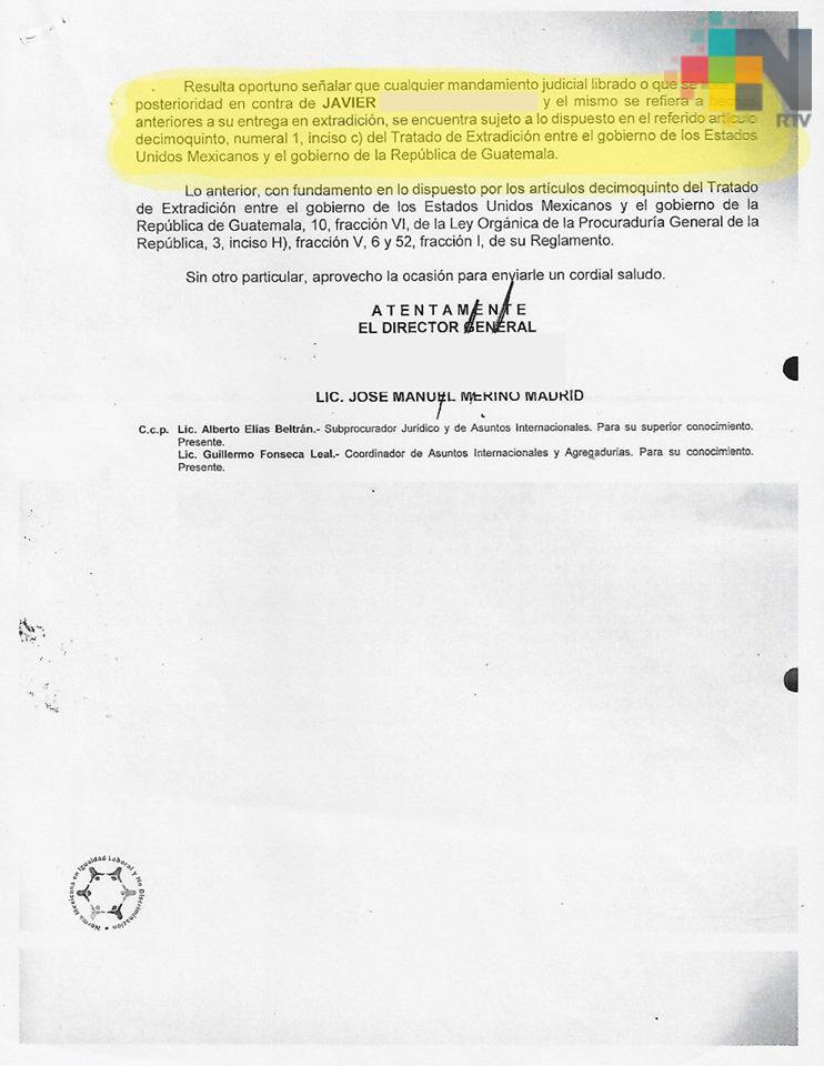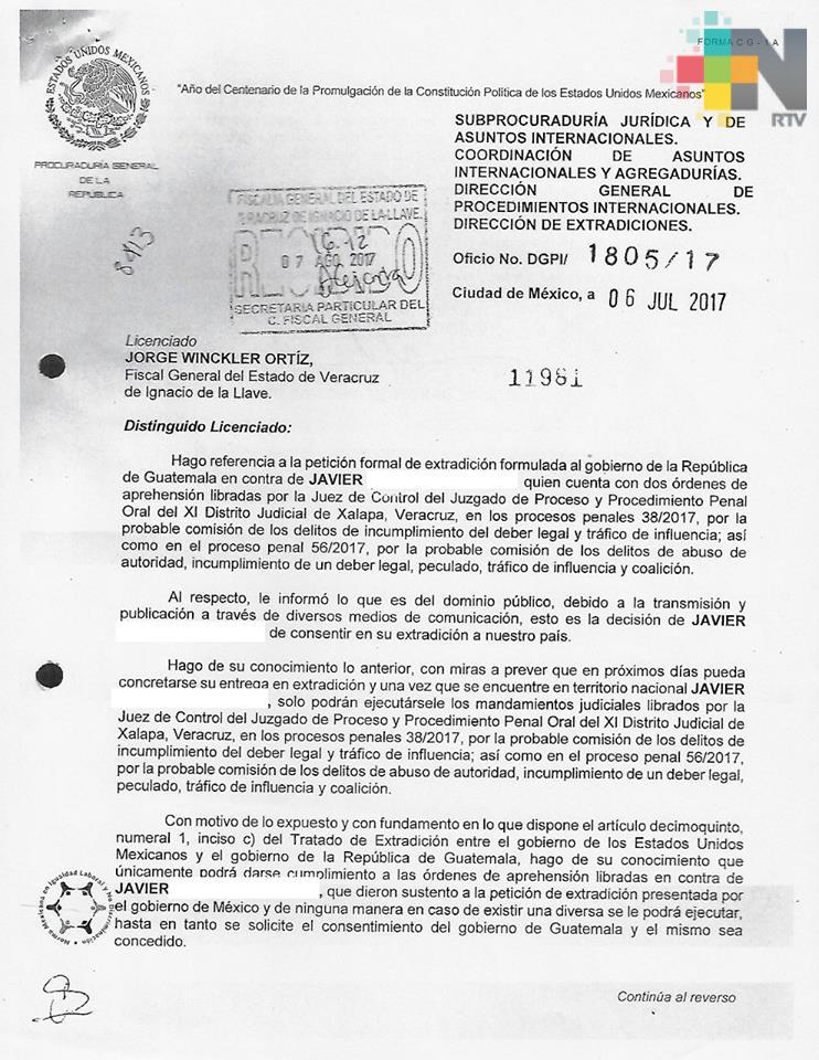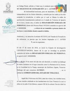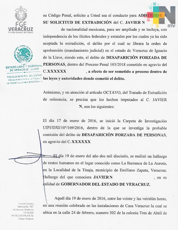 Al haber sido capturado en Guatemala, el ex Gobernador del Estado sólo puede ser juzgado en nuestro país por aquellos delitos señalados en la solicitud de extradición, por eso, el día de hoy, el Fiscal General del Estado Jorge Winckler Ortiz solicitó formalmente a la Procuraduría General de la República y a la Secretaría de Relaciones Exteriores, se amplíe la solicitud de extradición del C. JAVIER “N”, para que se incluya, con independencia de los ilícitos federales y estatales por los cuales ya ha sido aceptada la extradición por parte del Estado de Guatemala, el delito de DESAPARICIÓN FORZADA DE PERSONAS, a efecto de que Javier “N” pueda ser sometido a proceso en Veracruz por su participación en dicho delito.