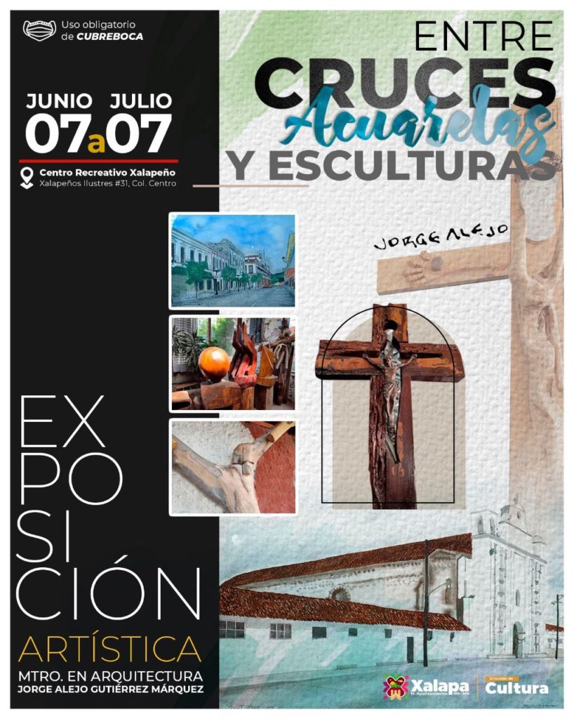 Hasta el 7 de julio continúa la exposición “Entre cruces, acuarelas y esculturas”, de Jorge Alejo, en el CRX. La información de todos los eventos para esta y la próxima semana se podrá consultar en la página de Facebook Cultura Xalapa.