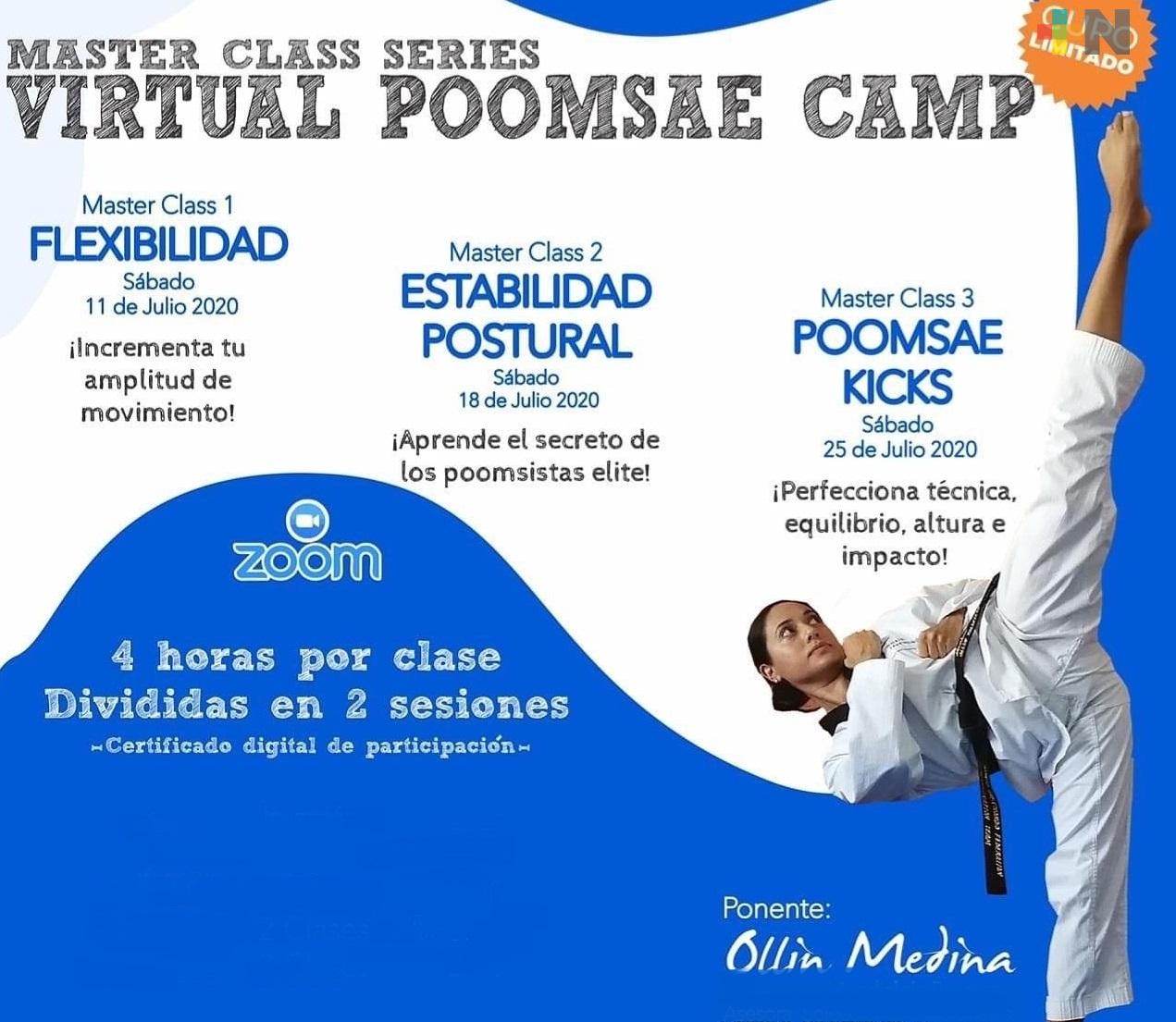 Algunos puntos que se abordarán en las clases virtuales, serán: movilidad articular, elongación muscular, amplitud de movimiento, ejercicios posturales, postura correcta en poomsae según biotipo de atleta (en posiciones, transiciones, cambios de dirección, técnica correcta de Ap, Dollyo y Yop chagui)” indicó en su red social de Facebook, Medina López.