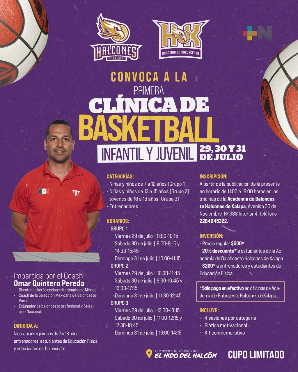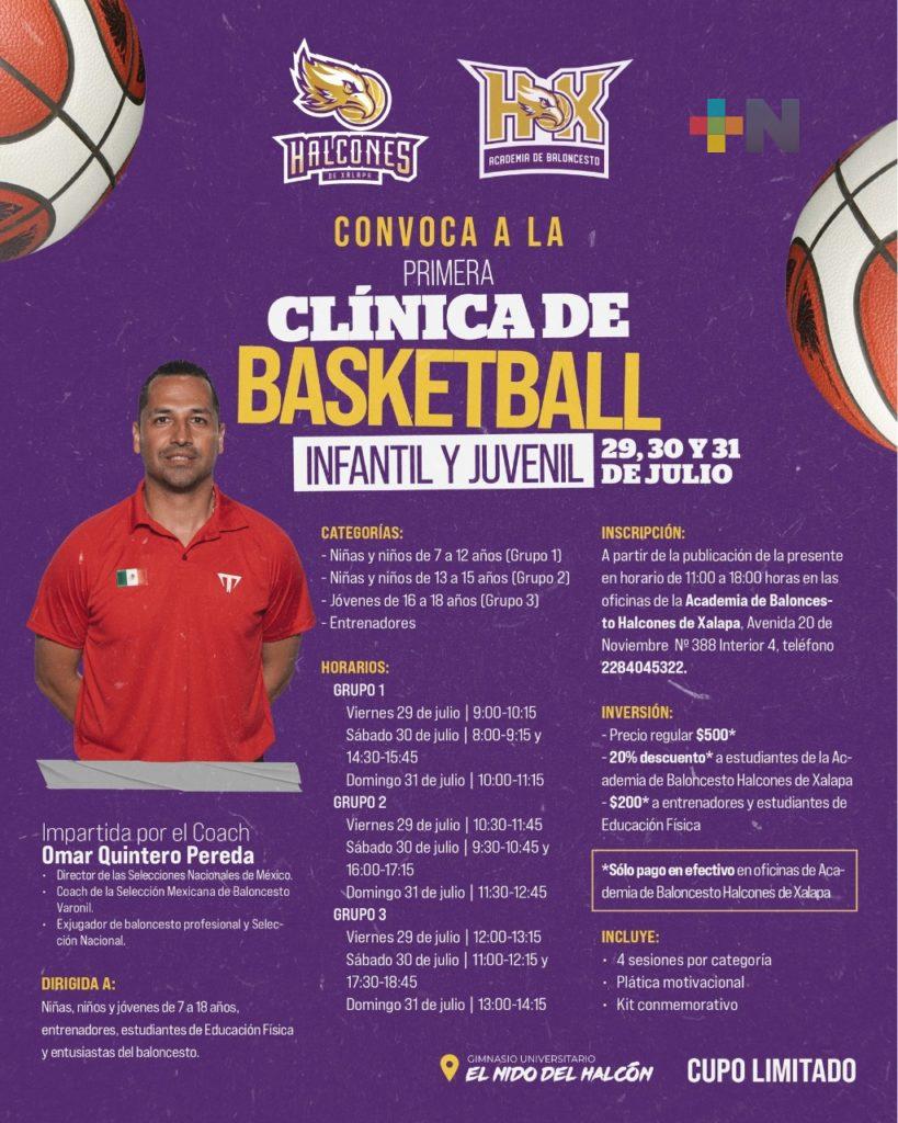 Xalapa, Ver.- Del 29 al 31 de julio del presente año, la Academia de Baloncesto Halcones de Xalapa efectuará una clínica de basquetbol en el Nido del Halcón impartida por el head coach de la Selección Nacional Mexicana del mencionado deporte, Omar Quintero Perea.