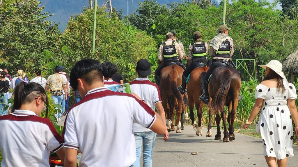 Personal operativo de la Policía Estatal Acreditable (PEA), así como las compañías K9 y Caballería de Fuerza Civil brindan atención, resguardo y acompañamiento a visitantes y turistas en la localidad El Tajín, municipio de Papantla.