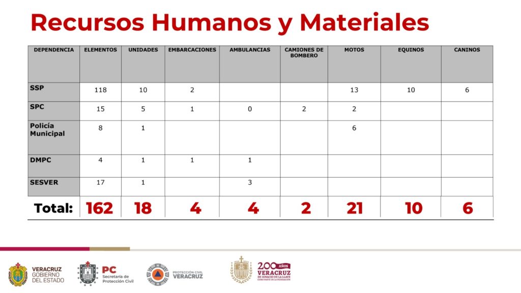 Con la instalación de un puesto de mando unificado, el despliegue de prevención y resguardo ciudadano dispone de 45 unidades terrestres (patrullas, ambulancias, camiones de bomberos y motocicletas), dos embarcaciones y el apoyo de equinos y binomios caninos de Fuerza Civil.