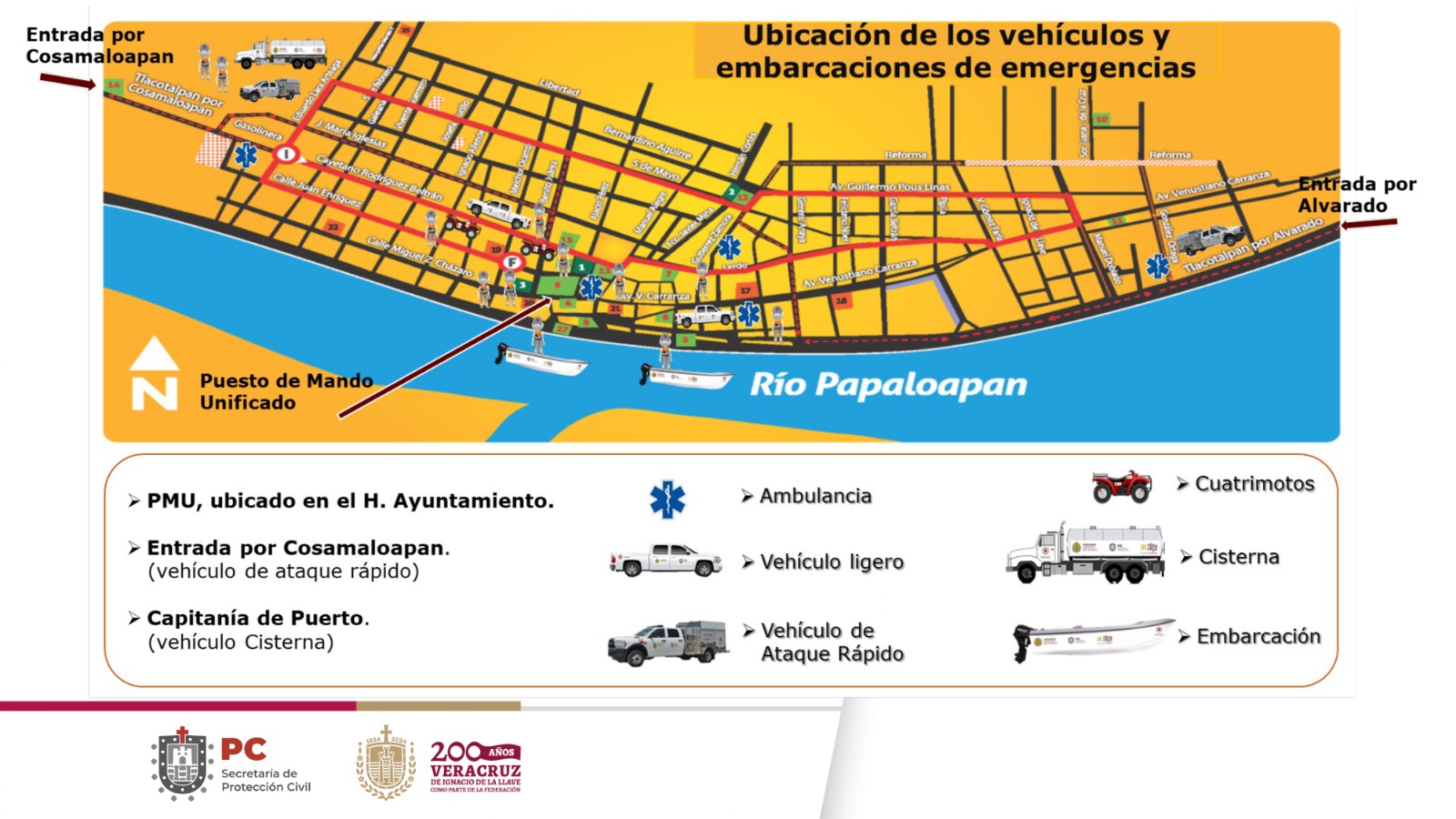 Con la instalación de un puesto de mando unificado, el despliegue de prevención y resguardo ciudadano dispone de 45 unidades terrestres (patrullas, ambulancias, camiones de bomberos y motocicletas), dos embarcaciones y el apoyo de equinos y binomios caninos de Fuerza Civil.