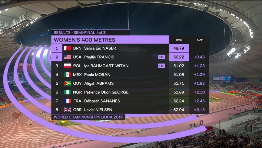 México.- La velocista jalisciense Paola Morán Errejón concluyó en el noveno lugar general, tras cronometrar 51 segundos, 08 centésimas, en la semifinal de 400 metros planos, que se realizó en el Campeonato Mundial Doha 2019.