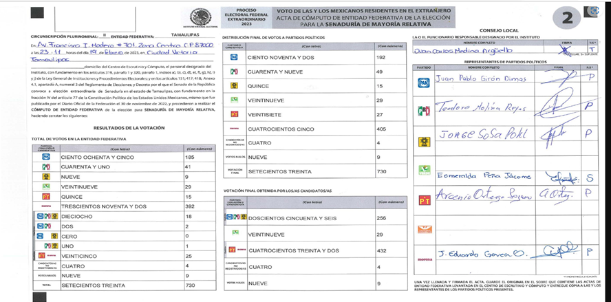 Ciudad de México.- El Instituto Nacional Electoral (INE) informa que 730 ciudadanas y ciudadanos tamaulipecos residentes en el exterior ejercieron su derecho a sufragar, a través de diversas modalidades en la elección extraordinaria de una senaduría de mayoría relativa en el estado de Tamaulipas 2023.
