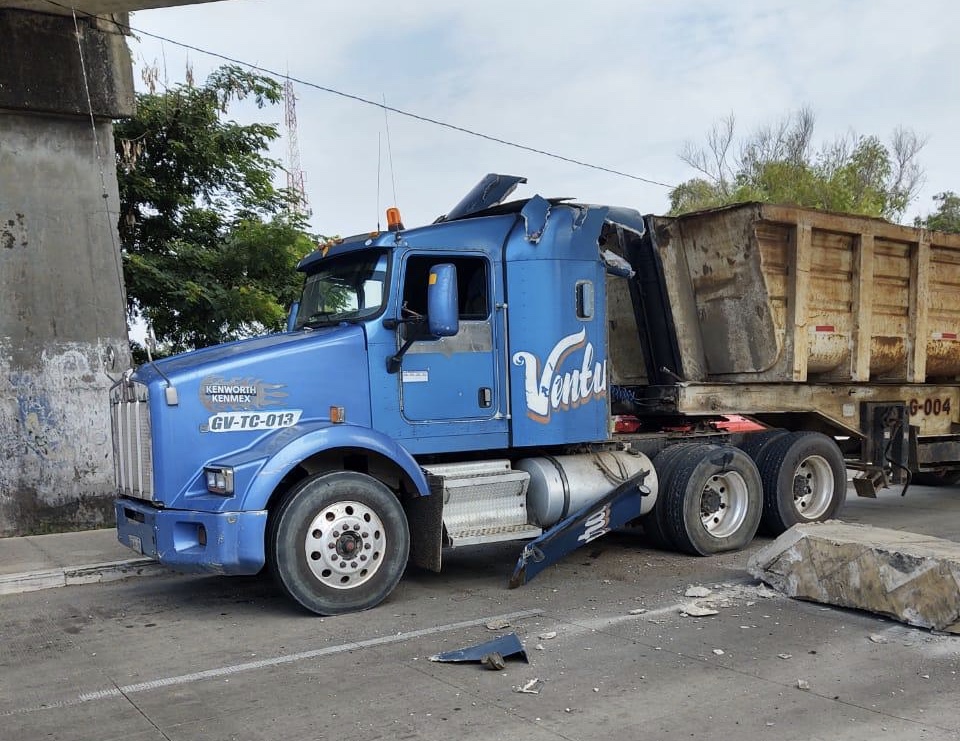 Coatzacoalcos, Ver.- Un pedazo de concreto de la obra inconclusa del distribuidor vial de Coatzacoalcos cayó encima de un tractocamión que transitaba sobre la avenida Transístmica a la altura de la Central Camionera.
