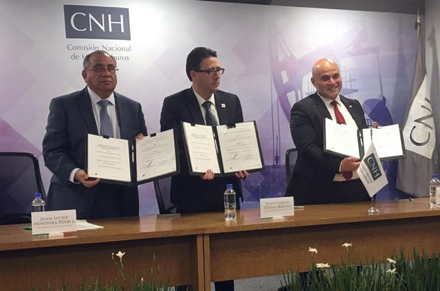 Los contratos fueron firmados por el director general de Pemex Exploración y Producción, Javier Hinojosa Puebla, así como por el representante de Deutsche Erdoel México, Juan Manuel Delgado Amador, y el representante de Petrolera Cárdenas-Mora, Shady Kabel Mohamed Hosny.