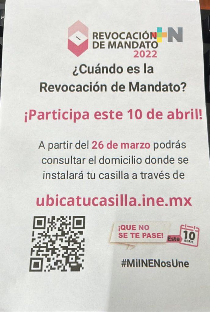 Veracruz, Ver.- En el Distrito 4, el personal del Instituto Nacional Electoral (INE) del puerto de Veracruz ha estado saliendo a realizar labores de promoción sobre la Revocación de Mandato, afirmó el vocal ejecutivo José Castillo Gameros.