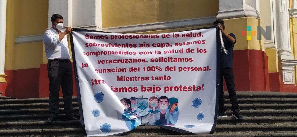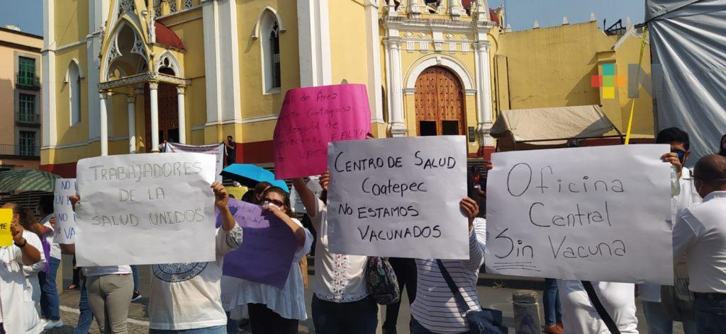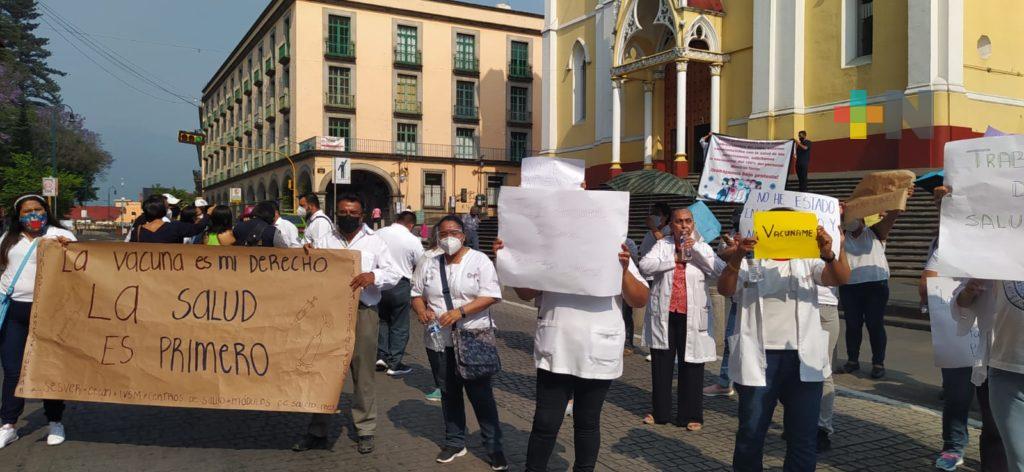 Xalapa, Ver.- Trabajadores del Centro Estatal de Cancerología, Instituto de Salud Mental y varios centros de Salud de la zona de Xalapa realizaron este domingo una marcha y manifestación en la plaza Lerdo para exigir que sean vacunados contra COVID-19, pues también son personal en riesgo de contagio, indicó la psicóloga Edith Mendoza del hospital de Salud Mental.