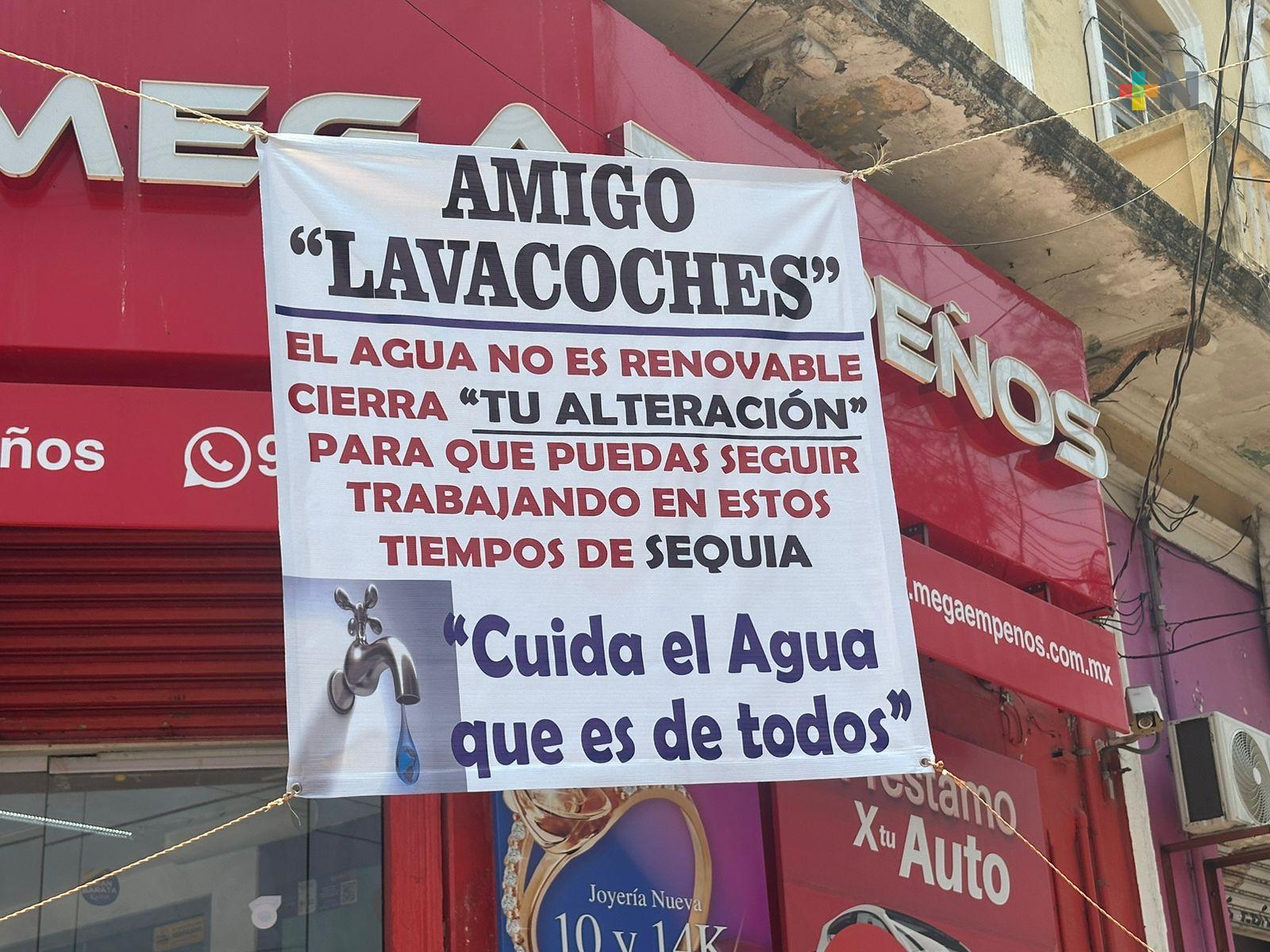 Coatzacoalcos, Ver.- Vecinos del centro de Coatzacoalcos colocaron una lona exhortando a los lavacoches a no desperdiciar el agua en esta temporada de estiaje y exhortándolos a cerrar las tomas irregulares, también llamadas por ellos «alteraciones».