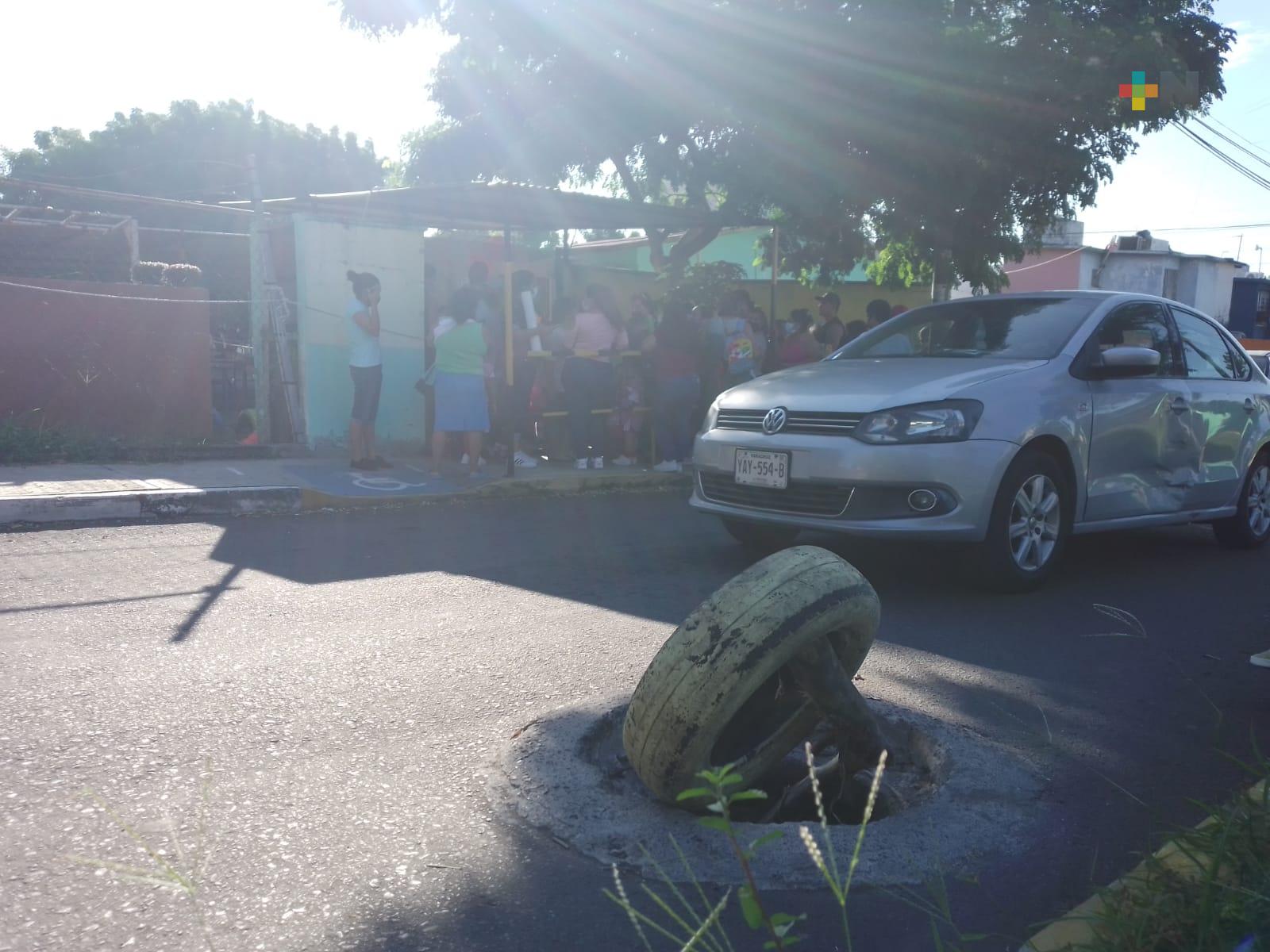 Veracruz, Ver.- Frente a un jardín de niños en el puerto de Veracruz, un registro lleva semanas sin tapa al grado que con llantas y un palo, vecinos tuvieron que destacarlo.