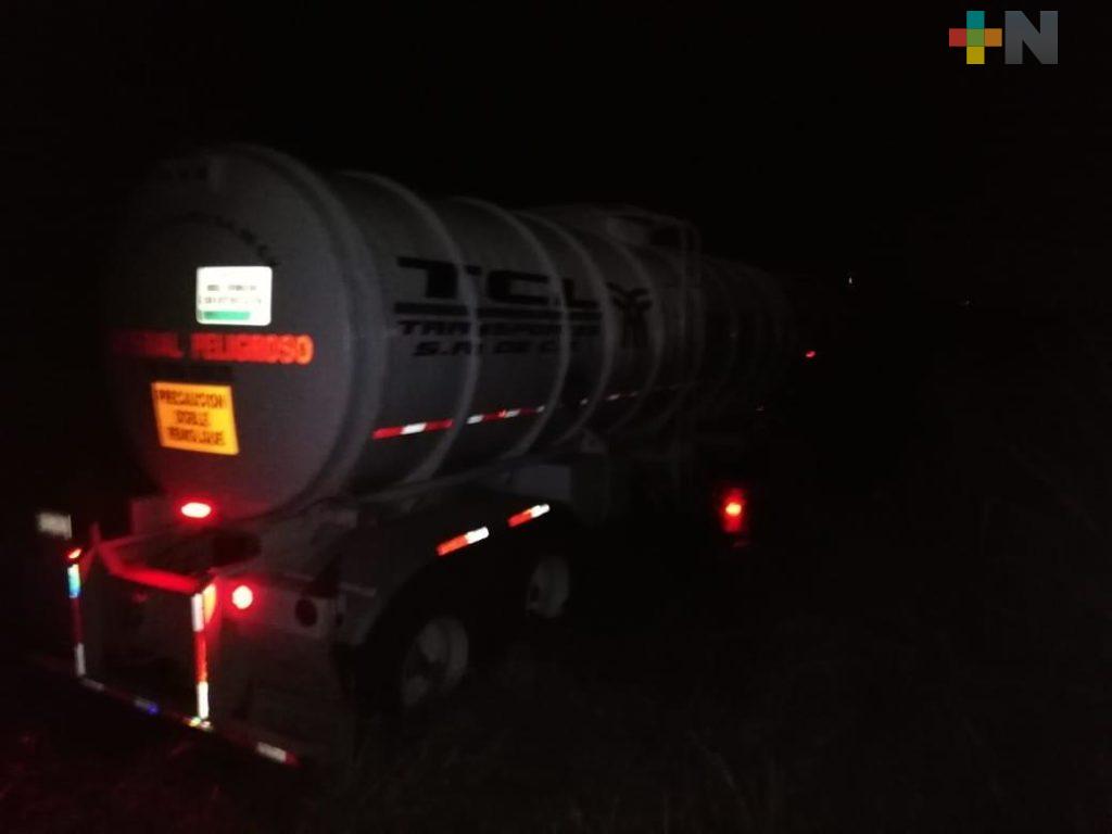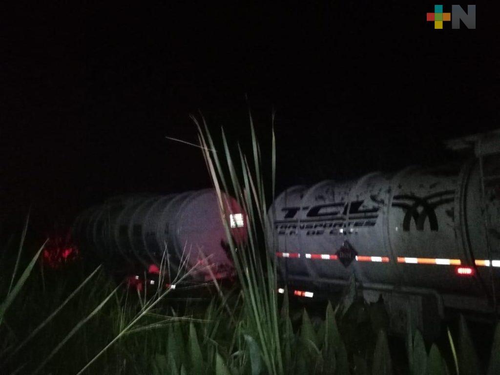 Coatzacoalcos, Ver.- Una pipa doble remolque terminó en la zona de pantanos de la carretera Coatzacoalcos-Minatitlán, Las Matas, en el carril con dirección al puerto.