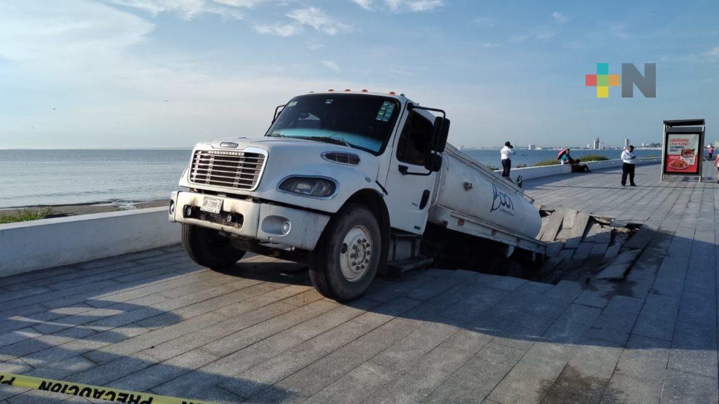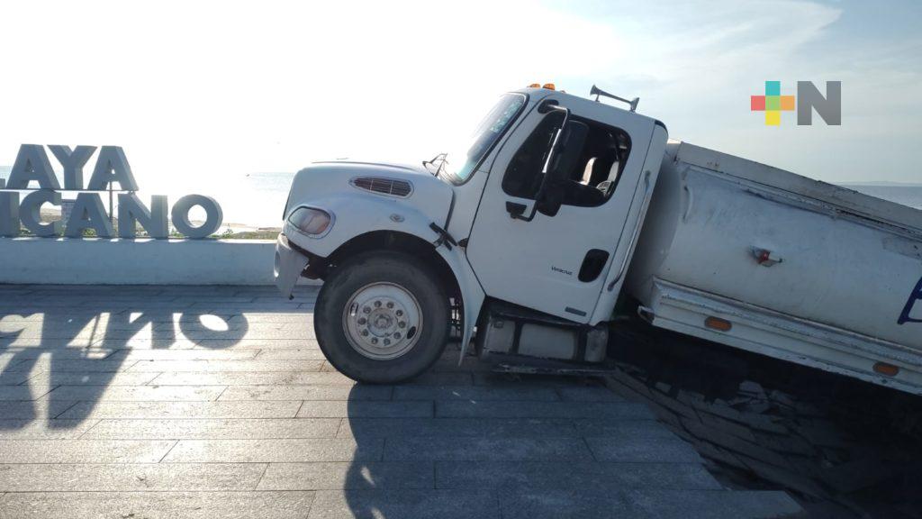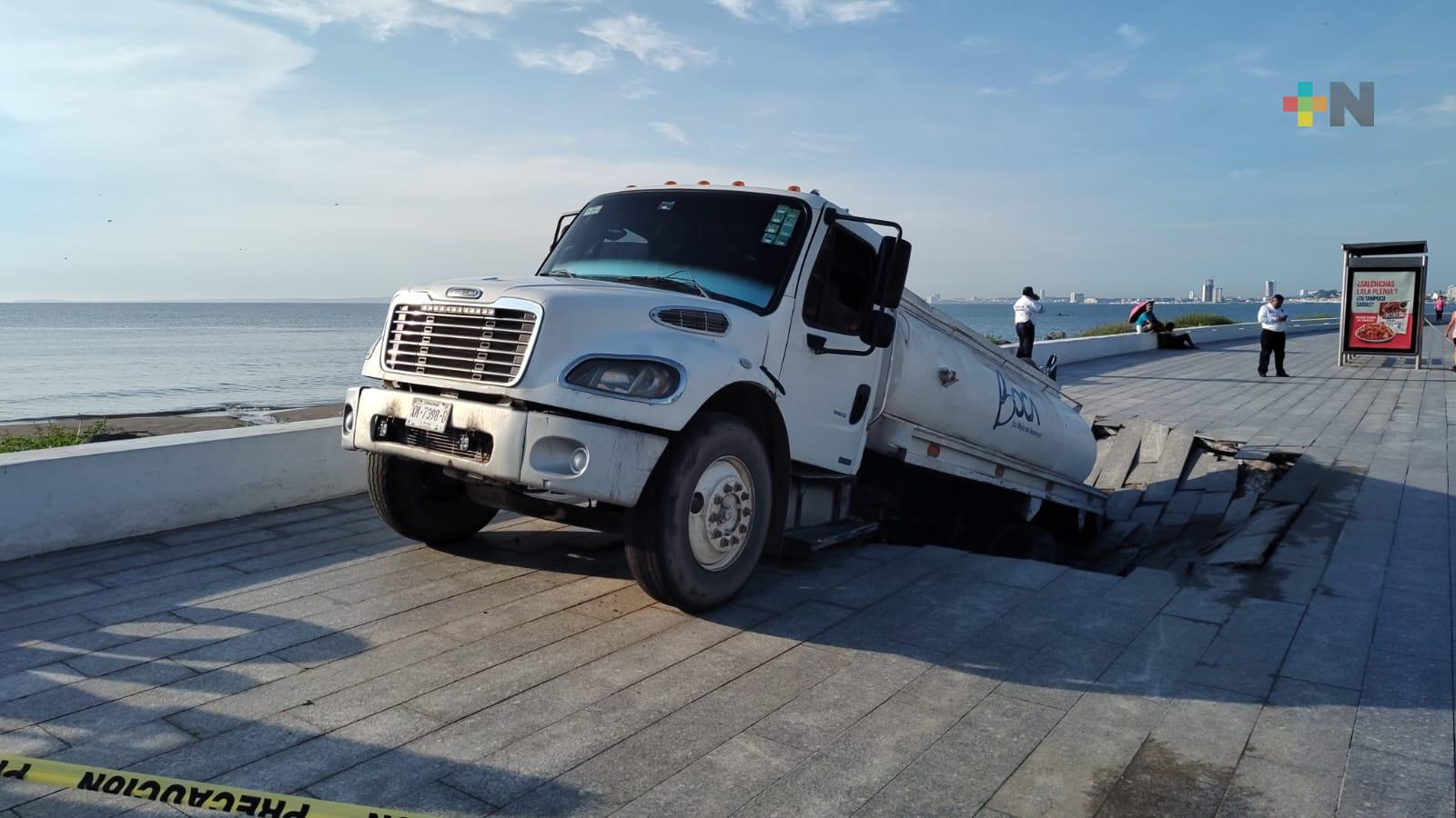 Veracruz, Ver.- La mañana de este jueves, una pipa del ayuntamiento de Boca del Río que realizaba labores de limpieza en el bulevar Manuel Ávila Camacho cayó a un socavón a la altura de la playa Pelícano.