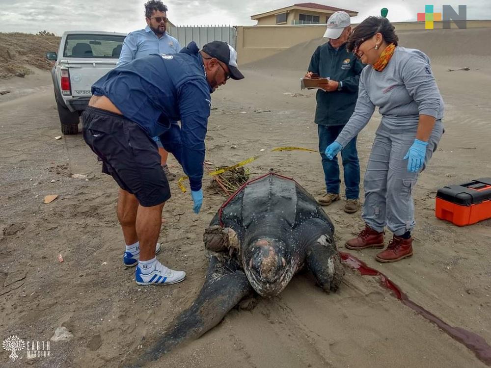 Alvarado, Ver.- Personal de la Dirección del Parque Nacional Sistema Arrecifal Veracruzano (PNSAV), realizaron el levantamiento de un ejemplar de tortuga Laúd hallada muerta en una playa del municipio de Alvarado.