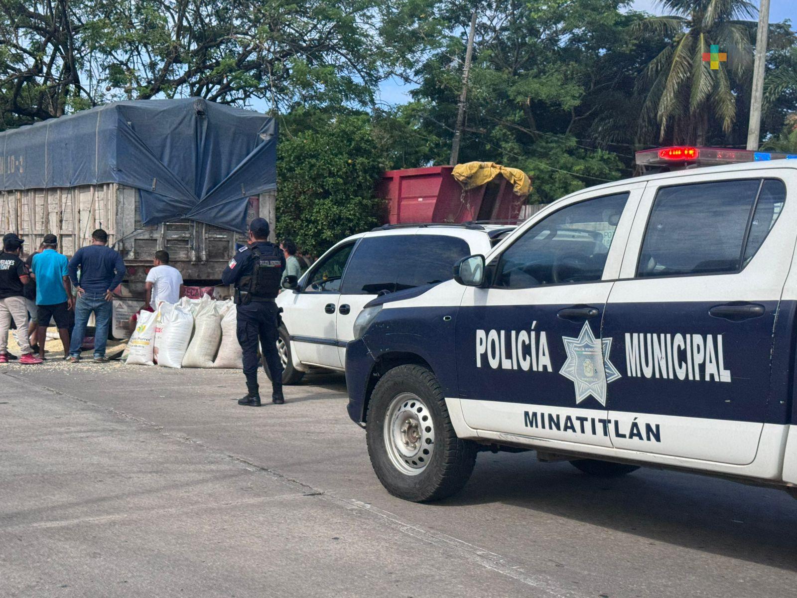 Coatzacoalcos, Ver.- Elementos de la policía estatal y municipal en Minatitlán evitaron un acto de rapiña de maíz en un tráiler en la ciudad petrolera.