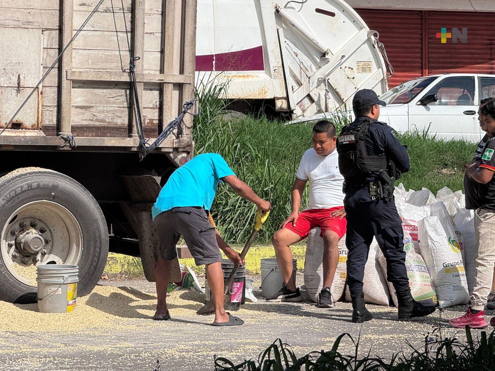 Sin embargo, de manera repentina, una de las compuertas del remolque fue abierta por personas no identificadas, lo que provocó que el maíz comenzara a caer sobre el pavimento.