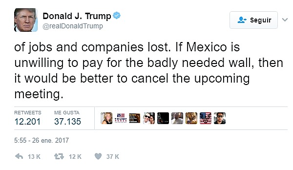 El mensaje es interpretado por analistas como un amago de cancelación de la reunión prevista con el presidente Enrique Peña Nieto el martes próximo, si no se admiten de antemano las prioridades que Donald Trump ha establecido en la relación bilateral.