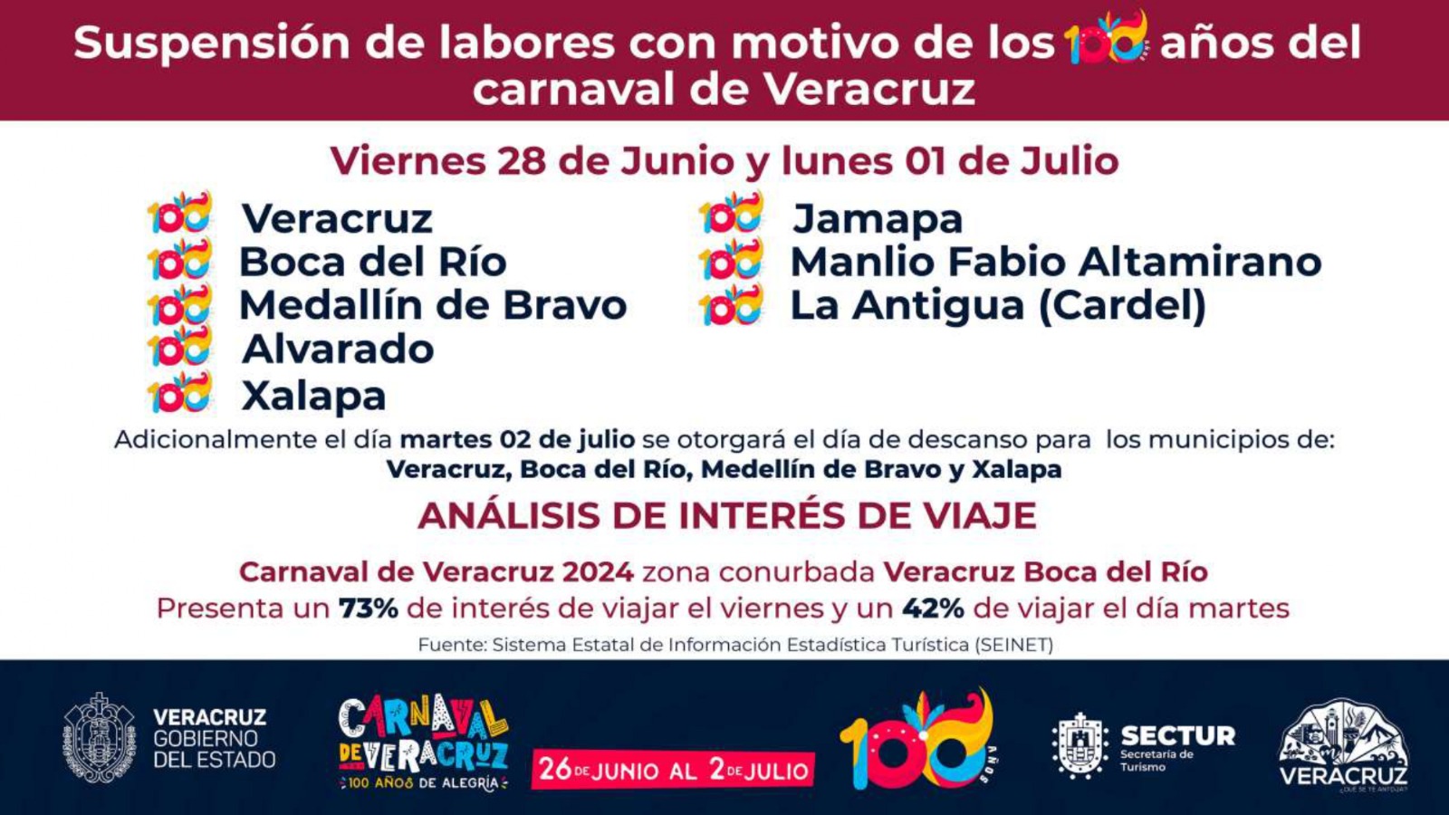 Xalapa, Ver.- La administración estatal declaró la suspensión de labores escolares y administrativas los días viernes 28 de junio y lunes 1 de julio en los municipios de Veracruz, Boca del Río, Medellín, Alvarado, Jamapa, Manlio Fabio Altamirano, La Antigua y Xalapa, con el fin de incentivar la asistencia al centenario del Carnaval de Veracruz.