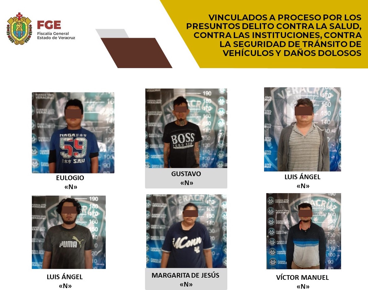 Acayucan, Ver.- La Fiscalía Regional Coatzacoalcos vinculó a proceso a Margarita de Jesús “N”, Luis Ángel “N”, Luis Ángel “N”, Eulogio “N”, Gustavo “N” y Víctor Manuel “N”, por los presuntos delitos contra la salud, contra las instituciones, contra la seguridad de tránsito de vehículos y daños dolosos.