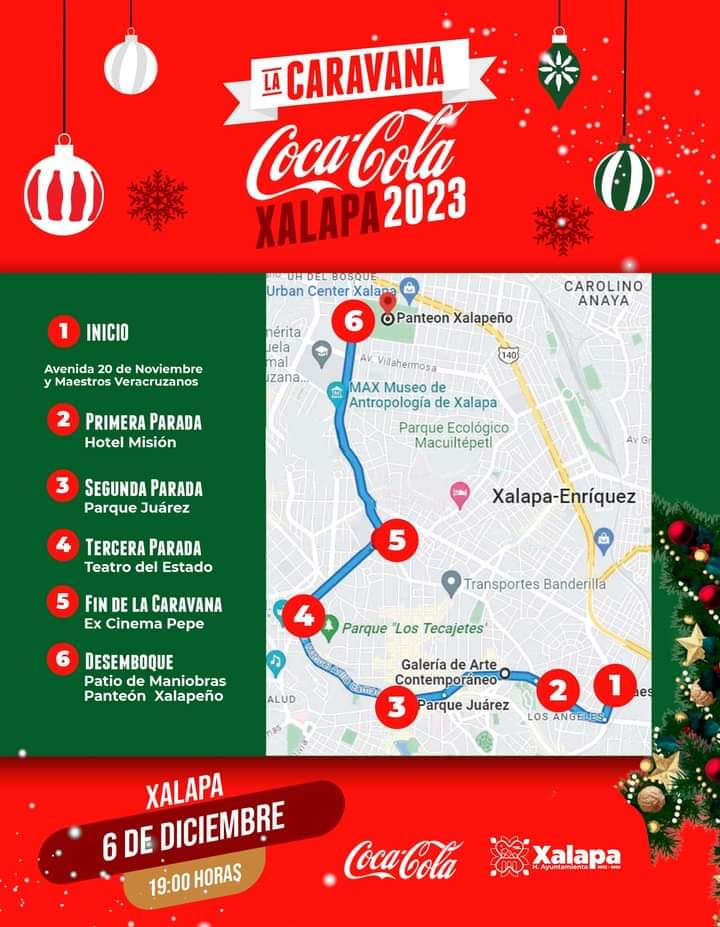 De acuerdo con el recorrido programado para la Caravana Coca-Cola 2023, este 6 de diciembre se harán cierres a la vialidad en la avenida 20 de Noviembre, las calles Xalapeños Ilustres, Enríquez y la avenida Manuel Ávila Camacho, de las 17:00 a las 21:00 horas.