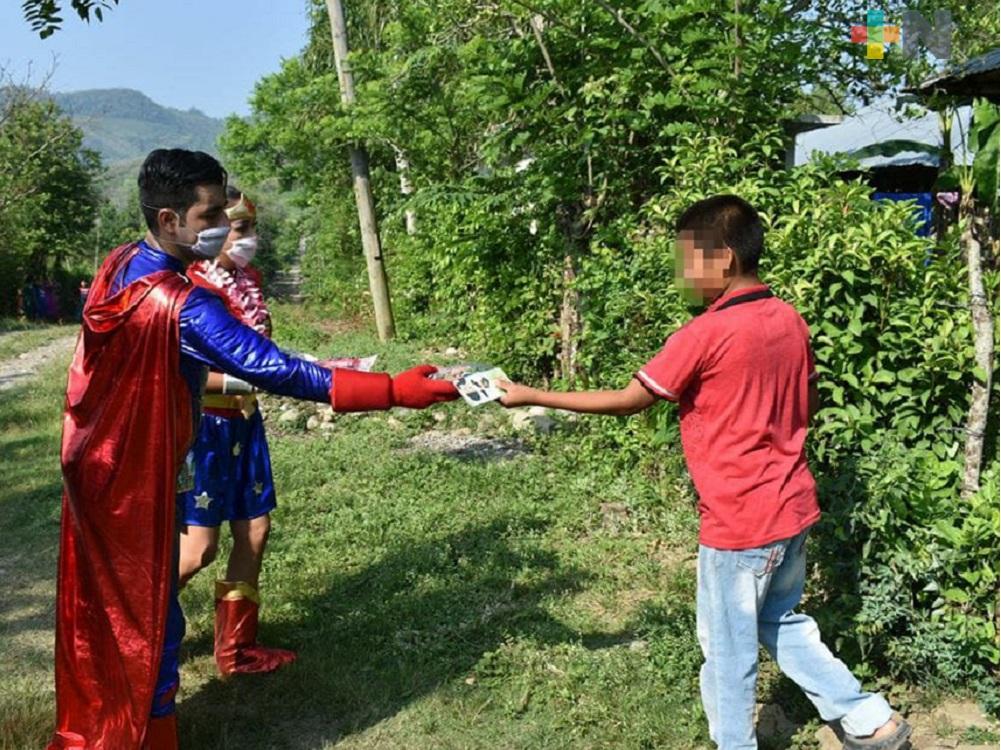 Chalma, Ver.- En el marco del festejo del Día del Niño en este municipio se realizó la entrega masiva de juguetes sanitizados previamente, además esta entrega de presentes se realizó bajo estrictas medidas de prevención sanitaria ante el COVID-19; autoridades municipales que interpretaron a cada uno de los superhéroes, portaba gel antibacterial, uso de cubrebocas, guantes y respetando la sana distancia, evitando la aglomeración de gente.