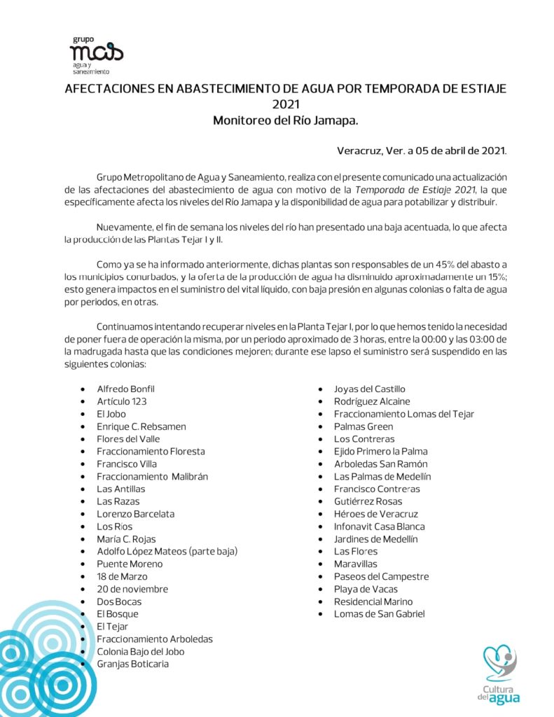 Veracruz, Ver.- Ante los niveles que ha registrado el Río Jamapa por la temporada de estiaje, el Grupo Metropolitano de Agua y Saneamiento de los municipios de Veracruz y Medellín de Bravo, informó que la planta potabilizadora Tejar I operará de manera intermitente.