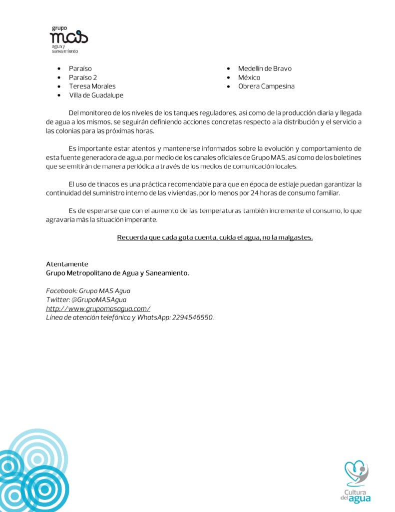 En un comunicado se detalló que la oferta de la producción de agua ha disminuido aproximadamente un 15 por ciento, por lo que se ha determinado poner fuera de operación dicha planta por un periodo aproximado de 3 horas, entre las 00:00 y las 03:00 de la madrugada hasta que las condiciones mejoren.