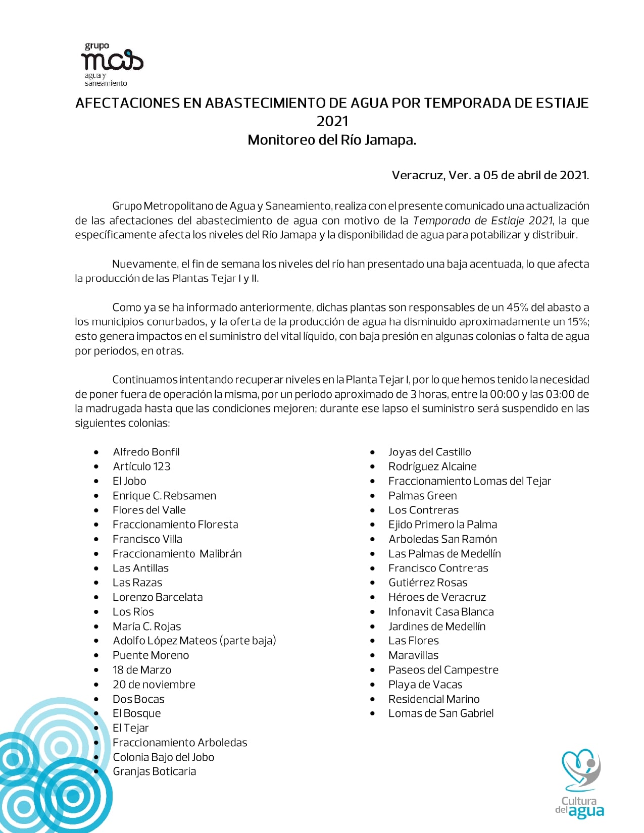 Veracruz, Ver.- Ante los niveles que ha registrado el Río Jamapa por la temporada de estiaje, el Grupo Metropolitano de Agua y Saneamiento de los municipios de Veracruz y Medellín de Bravo, informó que la planta potabilizadora Tejar I operará de manera intermitente.