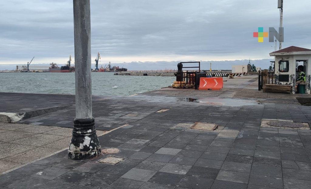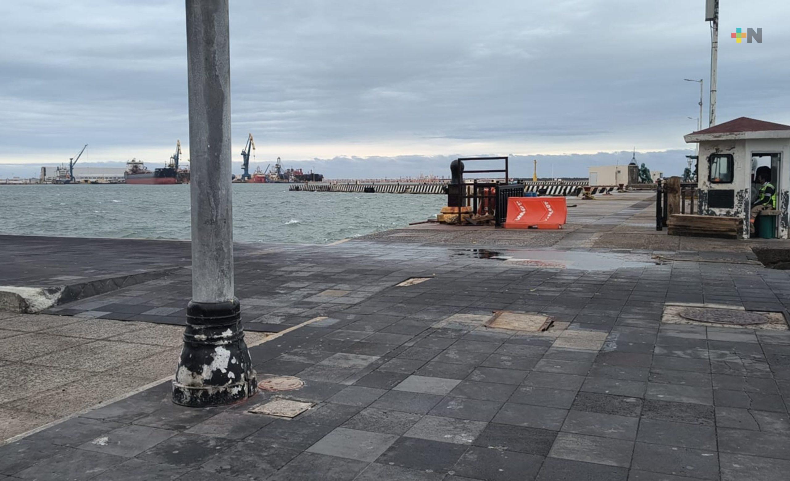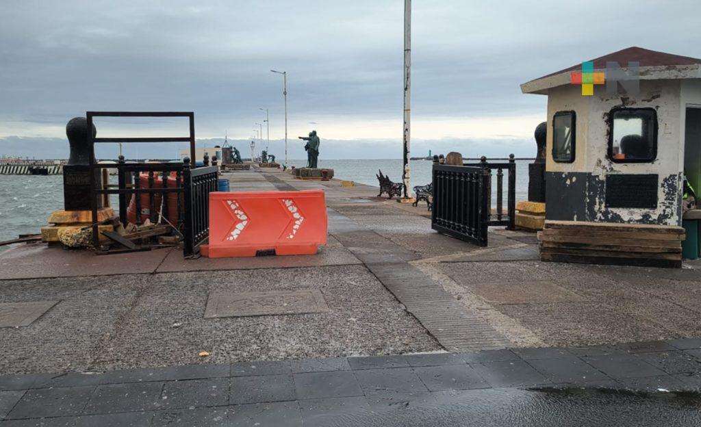Veracruz, Ver.- Se mantiene cerrado el muelle de la Secretaría de Marina Armada de México donde la tarde de este lunes cuatro turistas quedaron atrapados en medio del oleaje y fuertes ráfagas de viento asociadas al frente frío número 41.