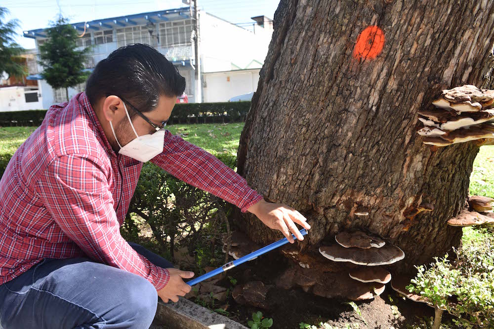 La Jacaranda, detalló, tiene una inclinación de 35 grados, daño estructural grave en la base por la presencia de hongos que se aprovechan de la madera podrida. Esto acelera la pérdida de la dureza e impide que se mantenga en pie.