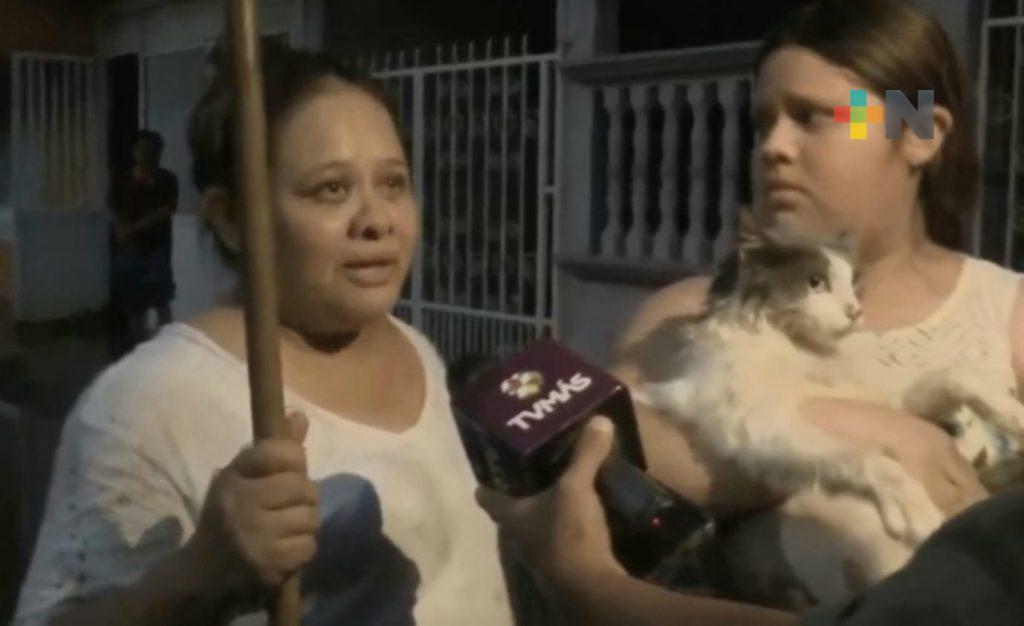 “A las 2 de la mañana nos dijeron que teníamos que evacuar y sí lo hicimos, evacuamos, pero el gatito se espantó, estaba atorado en el árbol. Vinimos cuando ya bajó el lodo, agua y todo. Lo bajamos del arbolito y nos lo llevamos. En la casa de mi suegra, en el hueleque, ahí estuvimos resguardadas. Pero ya todos juntos, muchas gracias”, relató Lizbeth Vidal, vecina del fraccionamiento La Florida de Poza Rica.