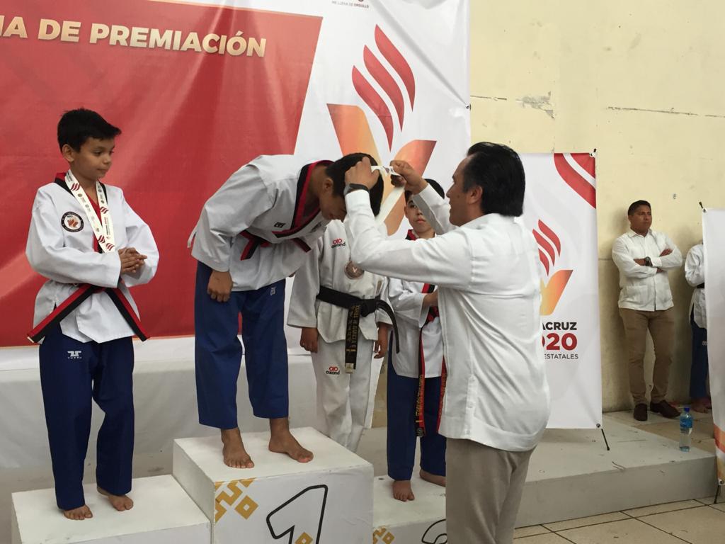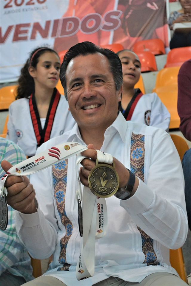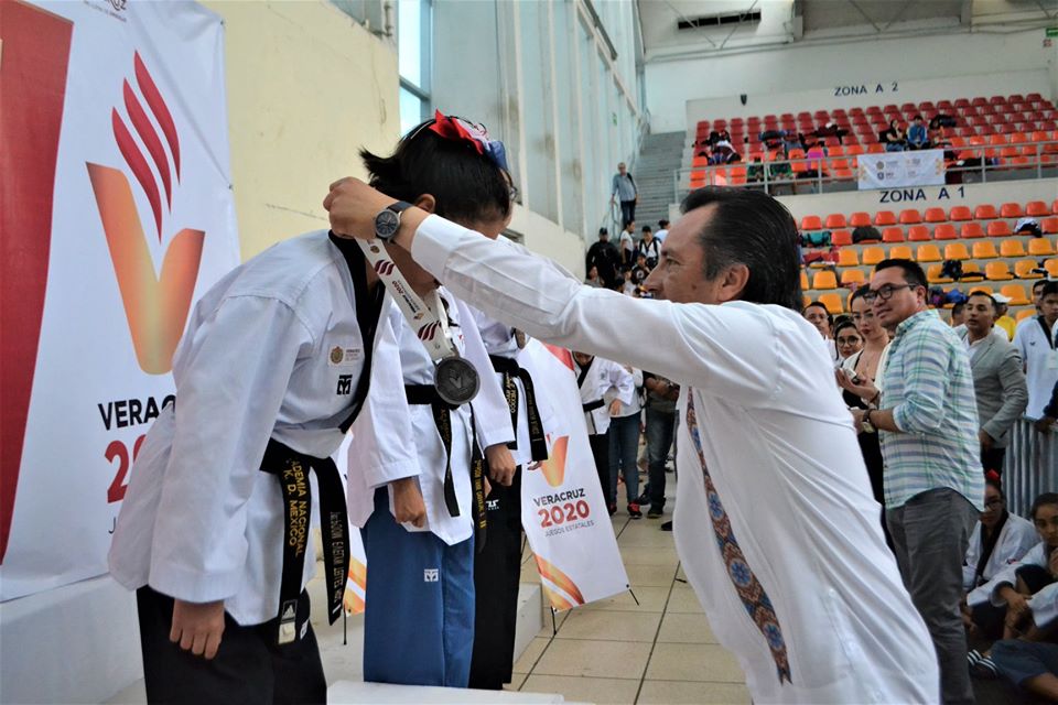 Veracruz, Ver.- Con la presencia del gobernador del Estado, Cuitláhuac García Jiménez, se realizó con éxito el taekwondo de los Juegos Estatales Veracruz 2020, en donde el ejecutivo estatal fue el encargado de premiar a los campeones de la modalidad de poomsae en el auditorio “Benito Juárez”.