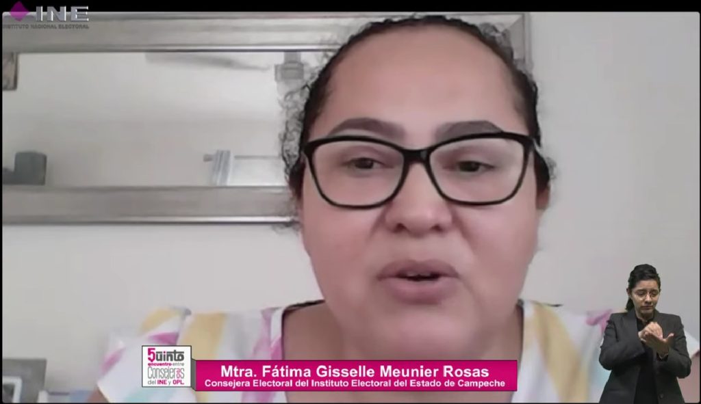 En su intervención, la Consejera Electoral y presidenta de la Comisión de Género y Derechos Humanos del Instituto Electoral del Estado de Campeche, Fátima Giselle Meunier Rosas, destacó que para poder llegar al escenario paritario en su entidad realizaron acciones como la elaboración de lineamientos para el registro de candidaturas a los cargos de elección popular y la aprobación de lineamientos para que los partidos políticos prevengan, atiendan y erradiquen la Violencia Política contra las Mujeres en Razón de Género.