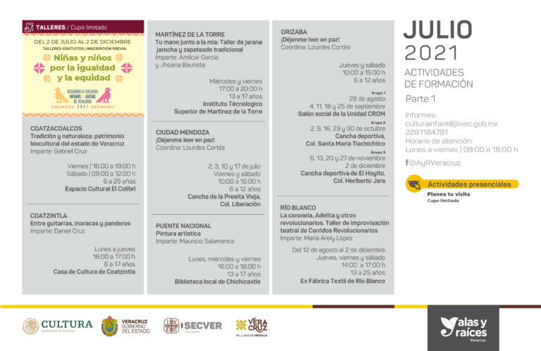 Los talleres se llevarán a cabo en modalidad virtual y presencial en los municipios de Coatzacoalcos, Coatzintla, Ciudad Mendoza, Orizaba, Martínez de la Torre, Río Blanco, Puente Nacional, San Andrés Tlalnelhuayocan, Santiago Tuxtla, Soteapan, Teocelo, Veracruz y Xalapa. Las actividades presenciales estarán sujetas al semáforo epidemiológico de cada localidad.