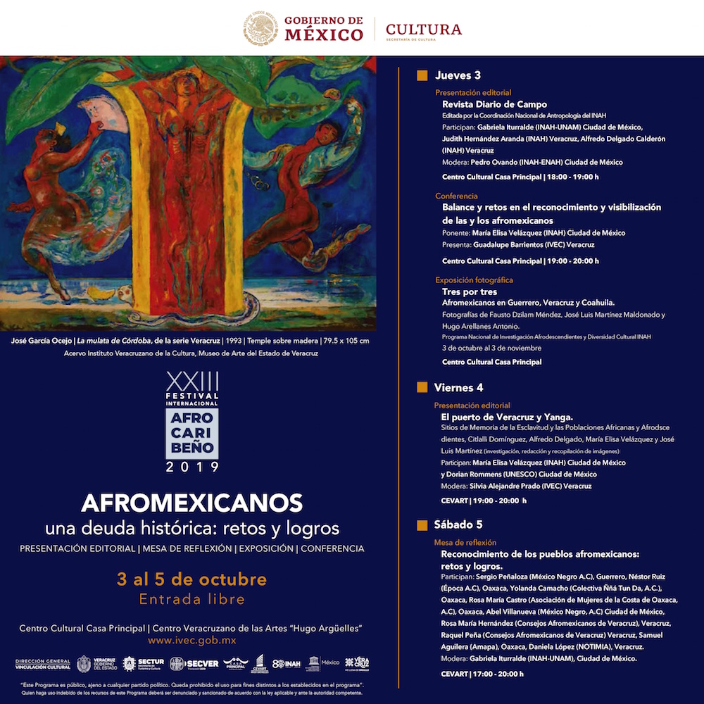Posteriormente, a las 19:00 se efectuará el conversatorio Balance y retos en el reconocimiento y visibilización de las y los afromexicanos que dará María Elisa Velázquez, titular de la CNAN, presenta Guadalupe Barrientos López, subdirectora de Educación e Investigación Artística del IVEC; para cerrar la jornada con la inauguración de la exposición Tres por tres. Afromexicanos en Guerrero, Veracruz y Coahuila