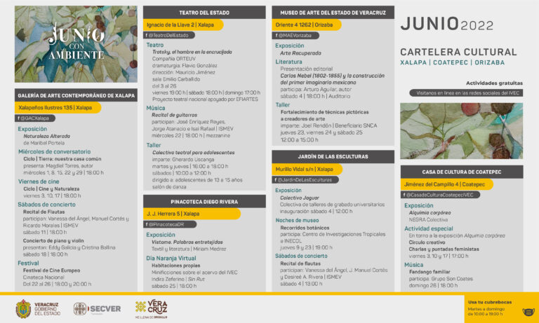 Te invitamos a consultar la programación completa de la red de recintos del Instituto Veracruzano de la Cultura en la página www.ivec.gob.mx, así como sus redes sociales Facebook @IVECoficial y Twitter @IVEC_Oficial.