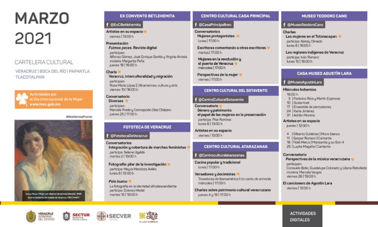 Veracruz, Ver.- El Instituto Veracruzano de la Cultura continúa brindando una diversa oferta cultural durante el mes de marzo, conformada por conversatorios, talleres, música, entrevistas y literatura que se transmitirán a través de las plataformas digitales de su red de recintos culturales en Xalapa, Coatepec, Veracruz, Boca del Río, Papantla, Orizaba y Tlacotalpan.