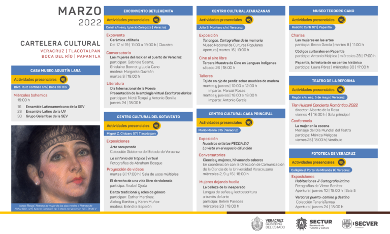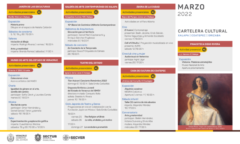 Veracruz, Ver.- Durante el mes de marzo, el Instituto Veracruzano de la Cultura presenta una diversa cartelera de actividades en su red de recintos culturales de Xalapa, Veracruz, Boca del Río, Orizaba, Papantla y Tlacotalpan, conformada por exposiciones, conversatorios, talleres, música, teatro, literatura y cine.