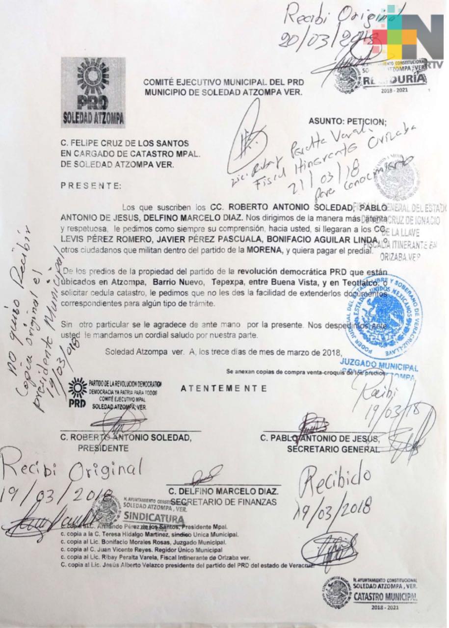 Presenta PRD denuncia por despojo de Morena en Soledad Atzompa