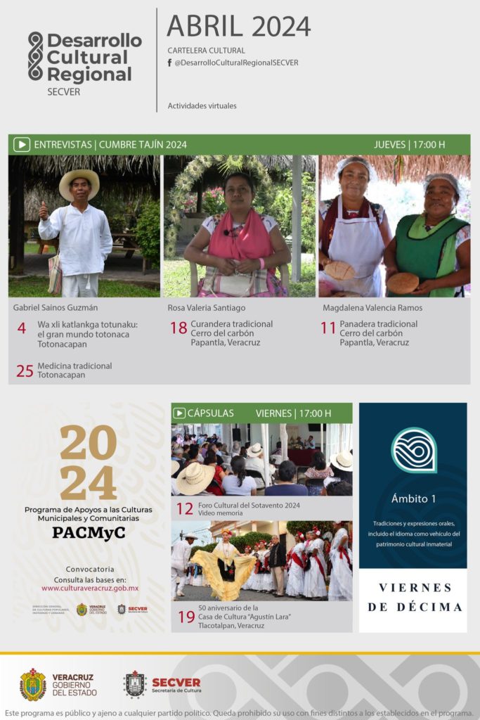 Sigue la transmisión de estos materiales audiovisuales del 4 al 25 de abril, los días jueves y viernes a las 12:00 y las 17:00 horas, a través de la página de Facebook @DesarrolloCulturalRegionalSECVER. Además, la SECVER invita a participar en la convocatoria del Programa de Apoyos a las Culturas Municipales y Comunitarias (PACMyC) 2024, que permanecerá abierta hasta el miércoles 22 de mayo a las 15:00 horas. Conoce las bases de la convocatoria y la variada oferta cultural que la Secretaría ha programado para ti este mes en www.culturaveracruz.gob.mx.