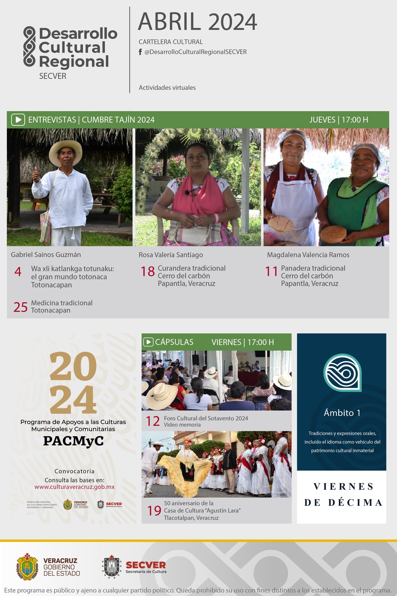 La Secretaría de Cultura de Veracruz invita a disfrutar de su cartelera virtual del mes de abril, que en esta ocasión incluye cuatro entrevistas realizadas durante la edición 2024 del Festival Cumbre Tajín, una video memoria del Foro Cultural del Sotavento, un video testimonial del 50 aniversario de la Casa de Cultura Agustín Lara y los versos de destacadas decimistas veracruzanas. Los materiales se compartirán los jueves y viernes del 4 al 25 de abril, a las 17:00 y a las 12:00 horas, a través de la página de Facebook @DesarrolloCulturalRegionalSECVER.