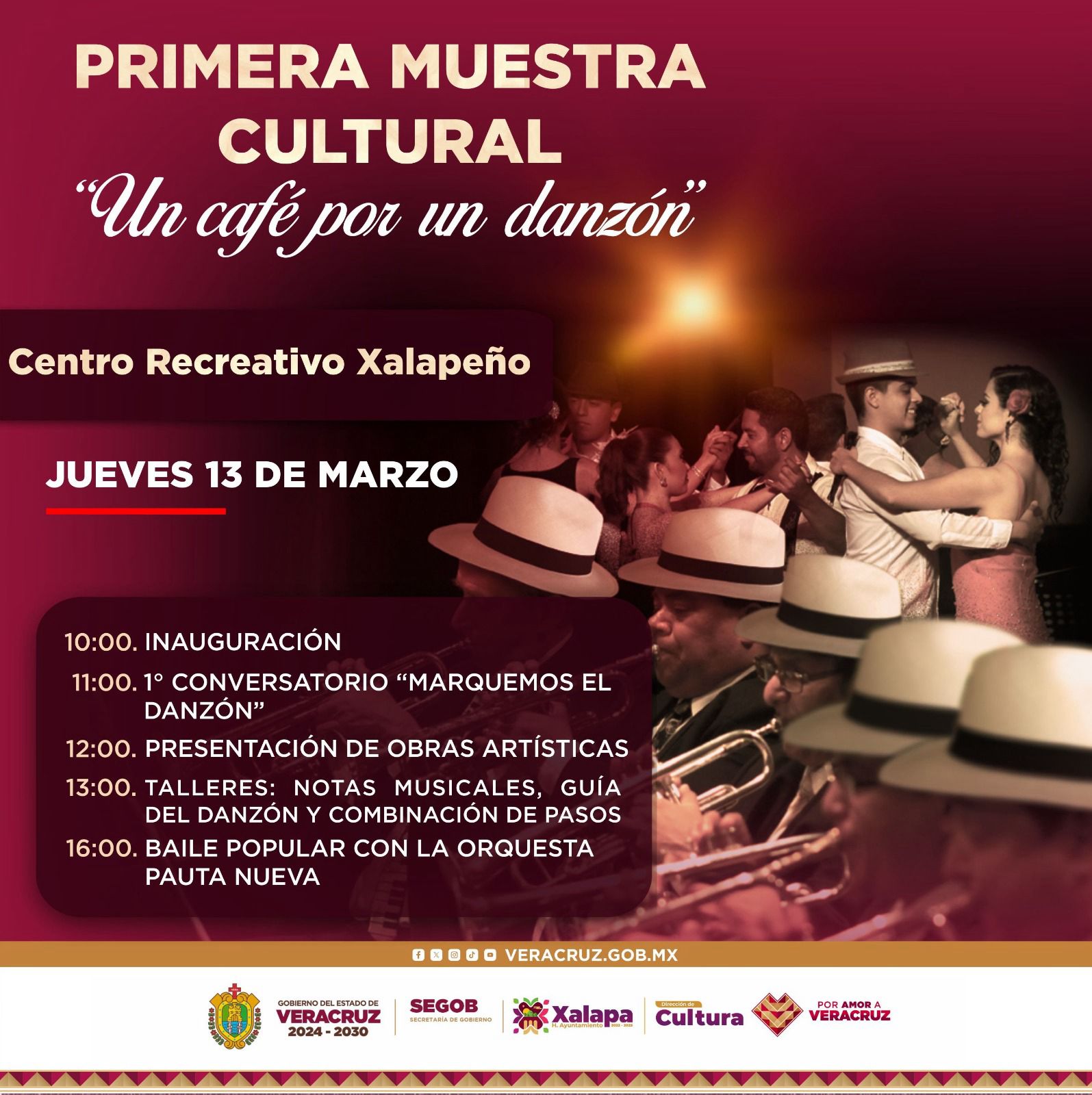 Los días miércoles 13 y jueves 14 a las 10:00 horas, se llevará a cabo la primera muestra cultural Un café por un danzón en el Centro Recreativo Xalapeño y el Barrio de Xallitic, respectivamente.