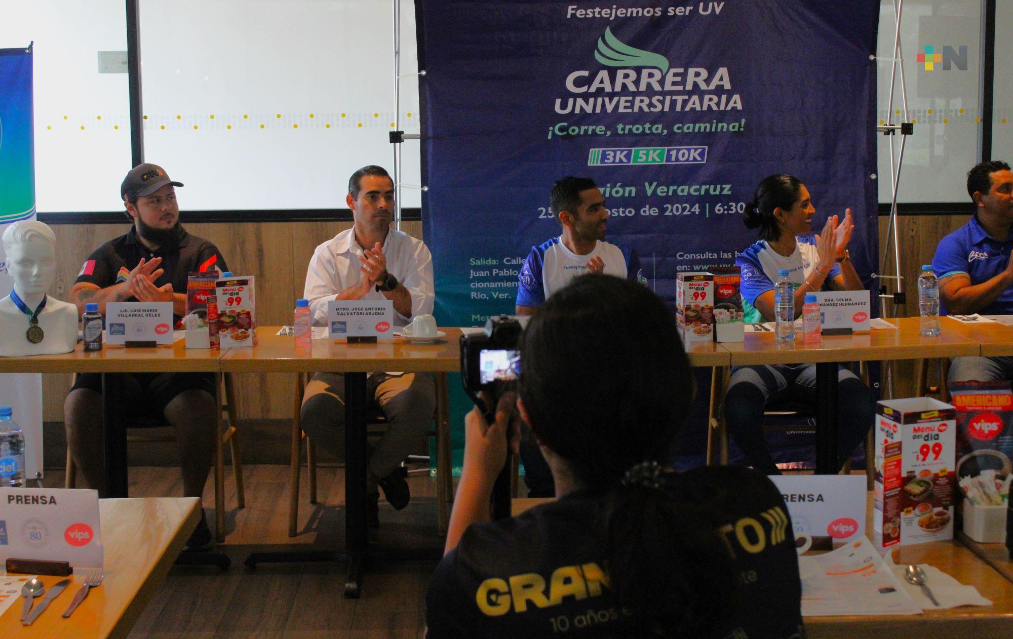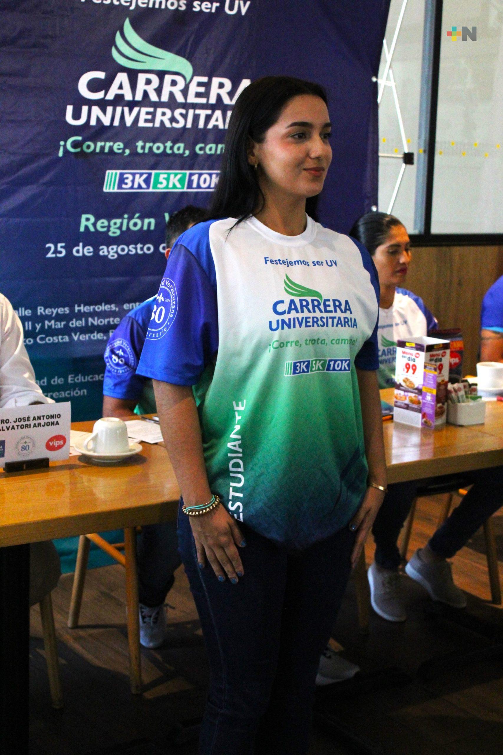Veracruz, Ver.- Como parte de los festejos del 80 aniversario de la Universidad Veracruzana, se presentó de manera oficial la Carrera Universitaria 2024 denominada “Corre, Trota o Camina”, la cual se desarrollará en la región Veracruz-Boca del Río el próximo domingo 25 de agosto a partir de las 06:30 horas.