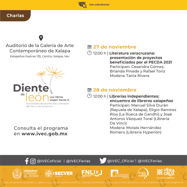 Veracruz, Ver.- El Instituto Veracruzano de la Cultura (IVEC) invita a disfrutar del ciclo de charlas del festival Diente de león. Los libros viajan hacia ti, que se realizará en modalidad presencial del 24 al 28 de noviembre, en punto de las 12:00 horas, en el auditorio de la Galería de Arte Contemporáneo de Xalapa. En los cinco diálogos se abordarán temas como la creación literaria, la ilustración, la edición, la promoción de la literatura y la distribución librera.