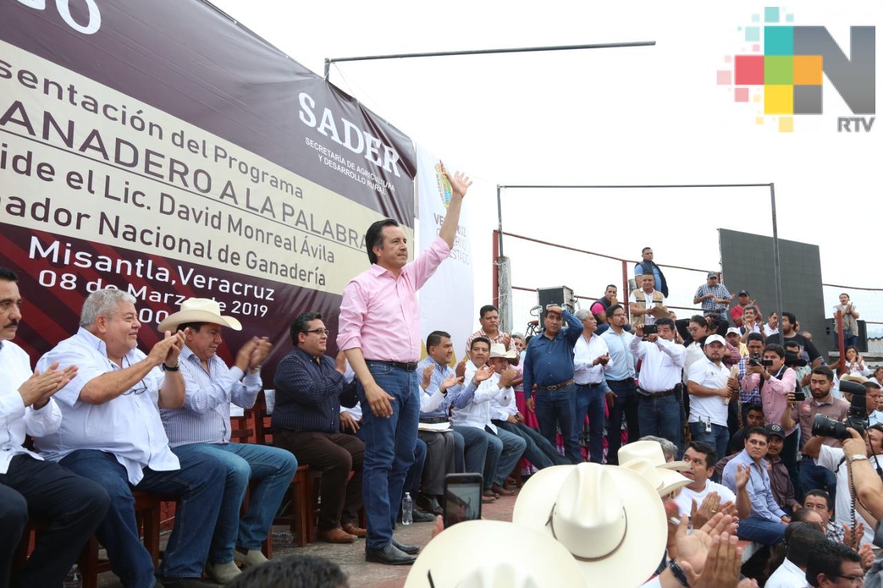 Misantla, Ver.- El gobernador Cuitláhuac García Jiménez y el coordinador nacional de Ganadería, David Monreal Ávila encabezaron la presentación del Programa Nacional Crédito Ganadero a la Palabra que permitirá desarrollar la economía de las familias ganaderas y la economía veracruzana.