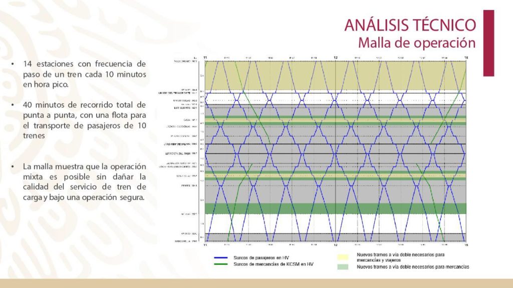 En el proyecto general se contará con 14 estaciones con frecuencia de paso de un tres cada 10 minutos en hora pico y 40 minutos de recorrido total de punta a punta, con una flota para el transporte de pasajeros de 10 trenes.