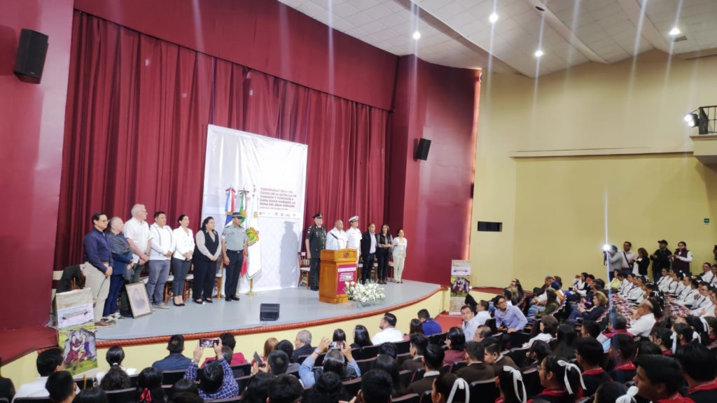 El secretario de Gobierno, Eric Cisneros Burgos en representación del Gobernador, acompañado de la Presidenta de Congreso, la diputada Margarita Corro, la Fiscal General, Verónica Hernández y la Presidenta del TSJE, la Magistrada Lisbeth Aurelia Jiménez así como representantes de la Legión Extranjera y la Consul Honoraria de Francia en Veracruz, Lygie de Schuyter.